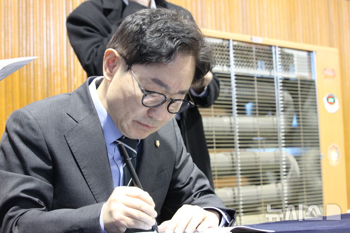 [천안=뉴시스] 최영민 기자=박범계 국회의원(더불어민주당·대전서구을)이 28일 충남 천안시 신당동 국립공주대학교 천안공과대학 체육관에서 열린 자신의 저서 출판기념회를 찾은 지지자들에게 손수 사인을 하고 있다. 2026.02.28 [email protected]