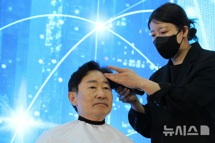 [천안=뉴시스] 최영민 기자=더불어민주당 박범계 국회의원(대전서구을) 28일 충남 천안시 국립공주대학교 천안공과대학에서 열린 자신의 저서 출판기념회 도중 충남대전 행정통합 필요성을 주장하며 삭발을 시작하고 있다. 2026.02.28 [email protected]