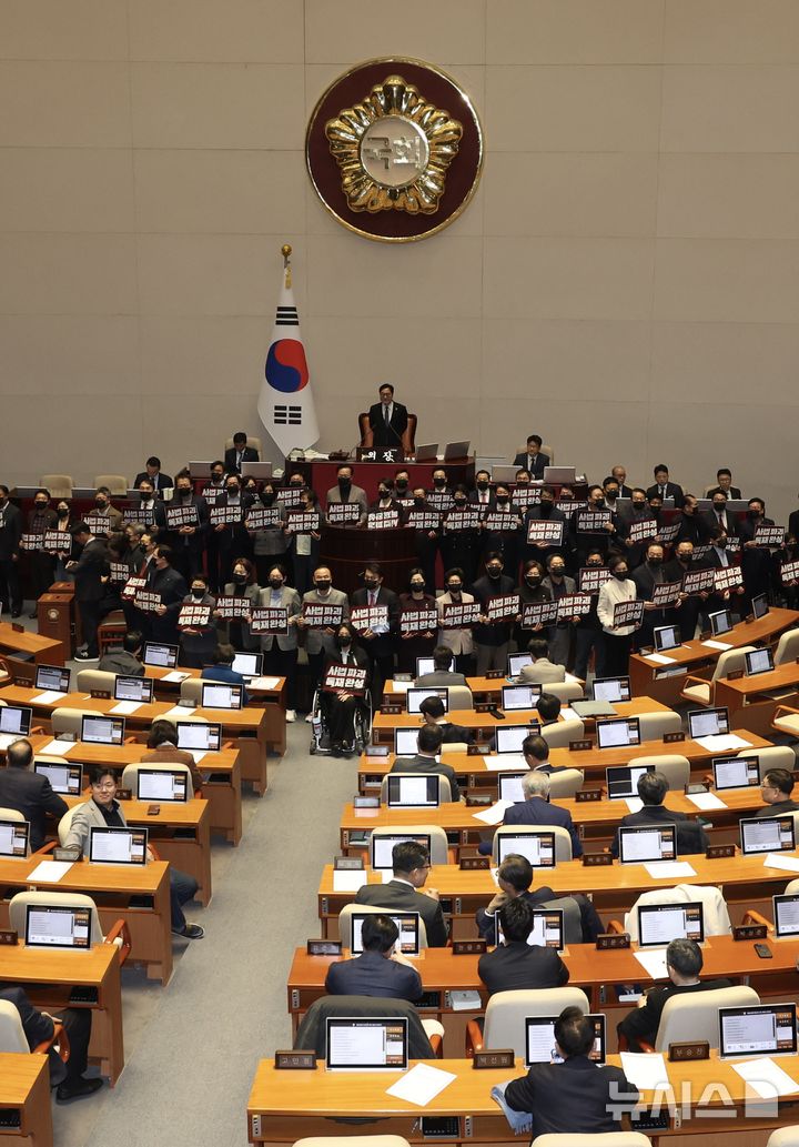 [서울=뉴시스] 조성봉 기자 = 28일 오후 서울 여의도 국회 본회의에서 '대법관 증원'을 핵심으로 하는 법원조직법 일부개정법률안에 대한 무제한토론(필리버스터) 종결 투표가 시작되자 국민의힘 의원들이 단상을 점거하고 침묵시위를 하고 있다. 2026.02.28. [email protected]