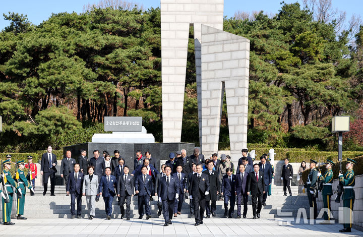 [대구=뉴시스] 이무열 기자 = 김민석 국무총리가 제66주년 2.28민주운동 기념일인 28일 대구 달서구 2.28민주운동기념탑에서 참배한 뒤 광장을 나서고 있다. 2026.02.28. [email protected]