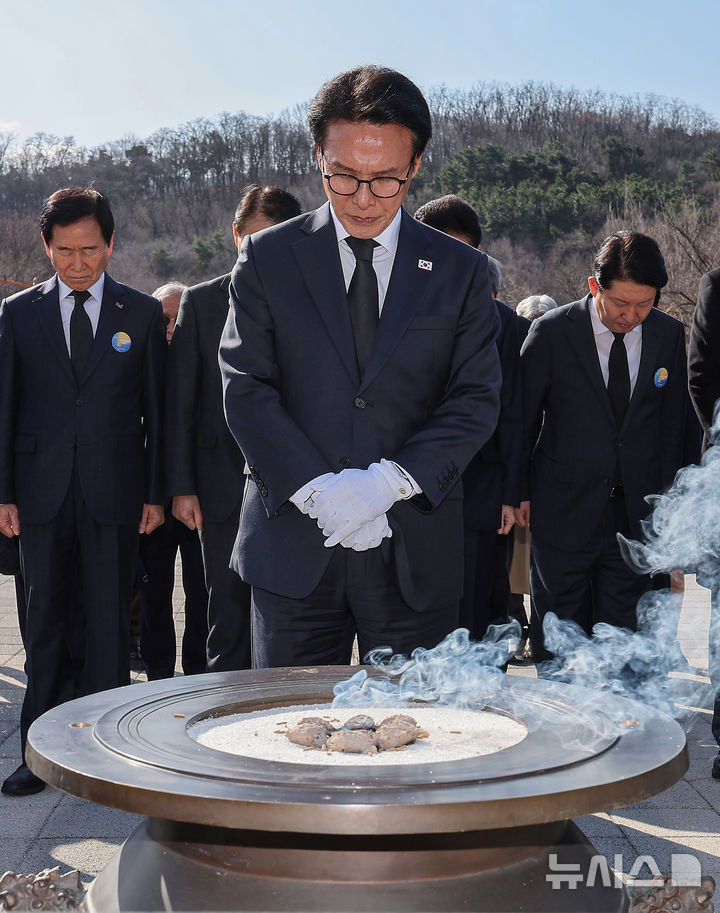[대구=뉴시스] 이무열 기자 = 김민석 국무총리가 제66주년 2·28민주운동 기념일인 28일 대구 달서구 2.28민주운동기념탑을 찾아 참배하고 있다. 2026.02.28. [email protected]