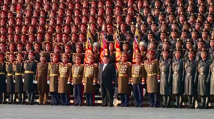 [서울=뉴시스] 김정은 북한 국무위원장이 지난 27일 노동당 제9차대회 기념 열병식 참가 부대 지휘관·병사들을 만나 기념사진을 찍었다고 북한 조선중앙TV가 28일 보도했다. (사진=조선중앙TV 캡처) 2026.02.28. [email protected]