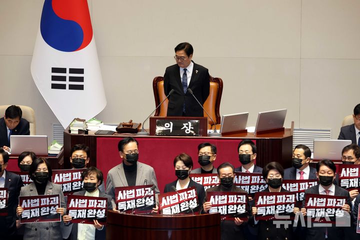 [서울=뉴시스] 조성봉 기자 = 우원식 국회의장이 28일 오후 서울 여의도 국회 본회의에서 '대법관 증원'을 핵심으로 하는 법원조직법 일부개정법률안에 대한 무제한토론(필리버스터) 종결 투표가 시작되자 단상을 점거하고 침묵시위를 하는 국민의힘 의원들을 바라보고 있다. 2026.02.28. [email protected]