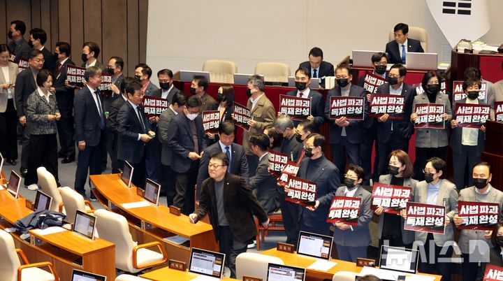 [서울=뉴시스] 조성봉 기자 = 28일 오후 서울 여의도 국회 본회의에서 '대법관 증원'을 핵심으로 하는 법원조직법 일부개정법률안에 대한 무제한토론(필리버스터) 종결 투표가 시작되자 국민의힘 의원들이 단상을 점거하고 침묵시위를 하고 있다. 2026.02.28. [email protected]