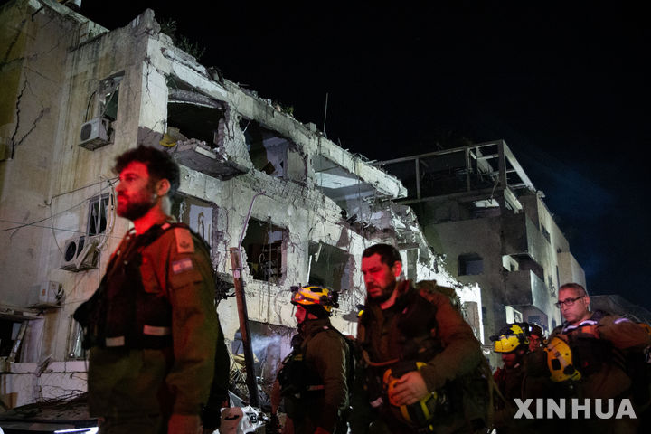 [텔아비브=신화/뉴시스] 1일(현지 시간) 이스라엘 텔아비브에서 구조대가 이란의 미사일 공격을 받은 현장을 수색하고 있다. 미국과 이스라엘이 지난달 28일 이란에 대해 '에픽 퓨리' 작전을 펼쳐 이란 최고지도자 아야톨라 알리 하메네이가 사망했다. 2026.03.01.