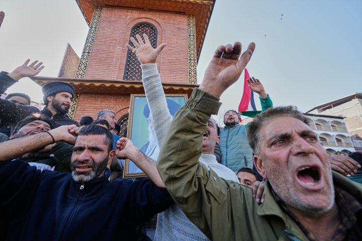 [스리나가르=AP/뉴시스] 1일(현지 시간) 인도령 카슈미르 스리나가르에서 시아파 신도들이 미국과 이스라엘의 공격으로 사망한 아야톨라 알리 하메네이 이란 최고지도자를 애도하고 있다. 2026.03.01.