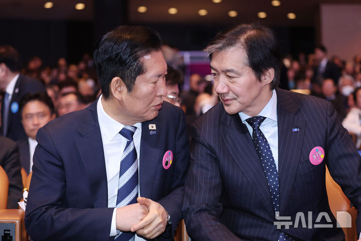 [서울=뉴시스] 최동준 기자 = 정청래 더불어민주당 대표와 조국 조국혁신당 대표가 1일 서울 강남구 코엑스에서 열린 제107주년 3·1절 기념식에서 대화하고 하고 있다. (청와대통신사진기자단) 2026.03.01. [email protected]
