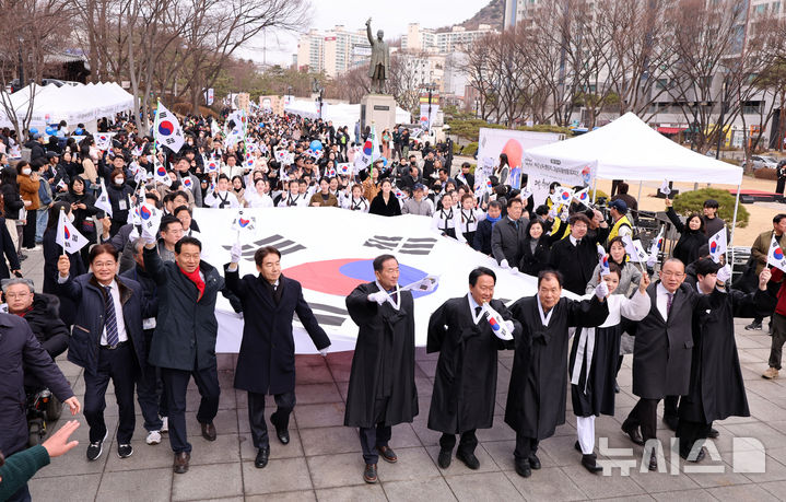 [서울=뉴시스] 이영환 기자 = 1일 오전 서울 서대문구 서대문형무소역사관에서 열린 제107주년 3·1절 기념 '1919 서대문, 그날의 함성' 행사를 마친 이성헌 서대문구청장 및 시민들이 독립문으로 행진하고 있다. 2026.03.01. [email protected]
