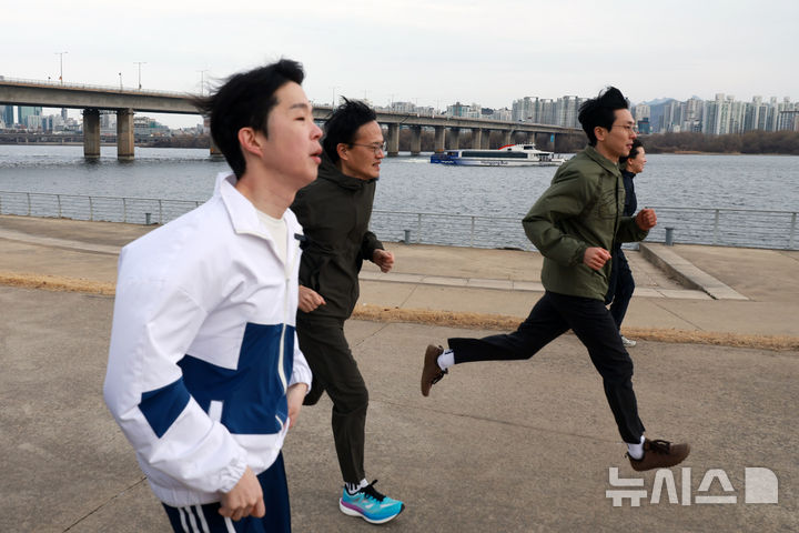 [서울=뉴시스] 고승민 기자 = 더불어민주당 서울시장 예비후보 박주민 의원과 김형남 예비후보가 1일 서울 여의도 한강공원 일대에서 '한강버스를 이겨라' 한강 러닝을 하고 있다. 2026.03.01. [email protected]