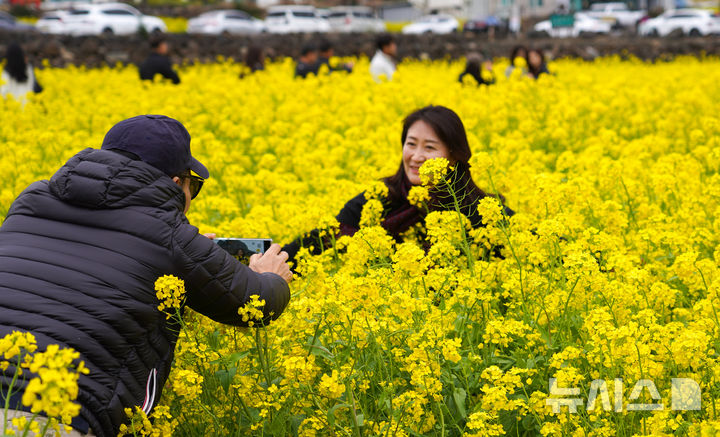 [서귀포=뉴시스] 우장호 기자 = 1일 오후 서귀포시 안덕면 산방산 앞 유채꽃밭에서 3.1절 연휴를 맞아 제주를 찾은 나들이객들이 만개한 봄꽃 사이를 거닐며 즐거운 시간을 보내고 있다. 2026.03.01. [email protected]