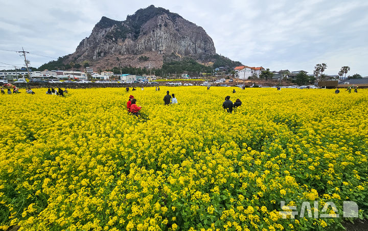 [서귀포=뉴시스] 우장호 기자 = 1일 오후 서귀포시 안덕면 산방산 앞 유채꽃밭에서 3.1절 연휴를 맞아 제주를 찾은 나들이객들이 만개한 봄꽃 사이를 거닐며 즐거운 시간을 보내고 있다. 2026.03.01. [email protected]
