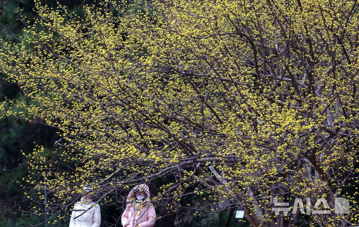 [부산=뉴시스] 하경민 기자 = 만물이 겨울잠에서 깨어난다는 절기인 경칩(驚蟄)을 나흘 앞둔 1일 부산 수영구 수영사적공원을 찾은 시민들이 활짝 핀 산수유 꽃을 구경하고 있다. 2026.03.01. [email protected]