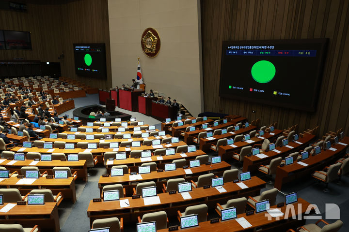 [서울=뉴시스] 고승민 기자 = 1일 서울 여의도 국회에서 열린 제432회국회(임시회) 제8차 본회의에서 국민투표법 전부개정법률안이 재석 176명, 찬성 176명으로 가결되고 있다. 국민의힘 의원들은 불참했다. 2026.03.01. [email protected]