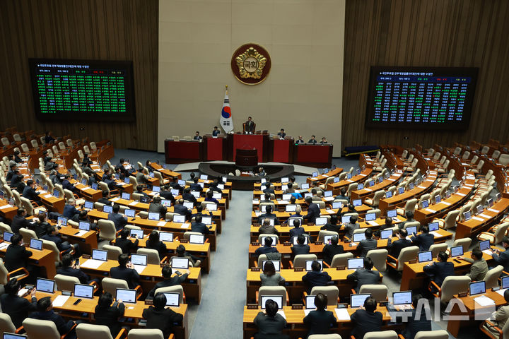 [서울=뉴시스] 고승민 기자 = 1일 서울 여의도 국회에서 열린 제432회국회(임시회) 제8차 본회의에서 국민투표법 전부개정법률안이 재석 176명, 찬성 176명으로 가결되고 있다. 2026.03.01. [email protected]