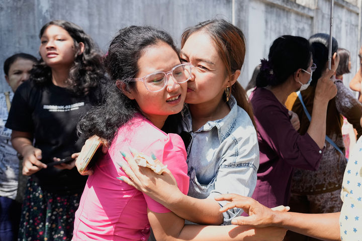 [양곤=AP/뉴시스] 2일(현지 시간) 미얀마 양곤 인세인 교도소에서 출소한 한 수감자(왼쪽)가 가족과 재회하고 있다. 미얀마 군사정권이 '테러단체 자금 조달 및 은신' 혐의로 기소했던 수감자들에 대한 특별 사면을 단행했다. 2026.03.02.