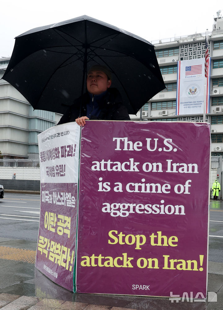 [서울=뉴시스] 추상철 기자 = 평화와통일을여는사람들(평통사)이 2일 오전 서울 종로구 주한미국대사관 앞에서 '미국-이스라엘의 이란 공격 중단'을 촉구하는 1인시위를 하고 있다. 2026.03.02. [email protected]