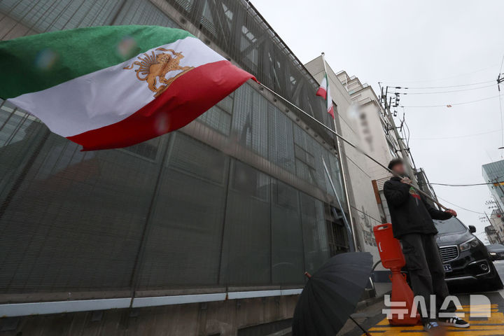 [서울=뉴시스] 조성우 기자 = 미국과 이스라엘의 이란 공습으로 아야톨라 알리 하메네이 최고지도자의 사망이 공식 확인된 가운데 2일 서울 용산구 주한 이란이슬람공화국 대사관 앞에서 한 이란인이 팔레비 왕조 시절 이란 국기를 흔들고 있다.