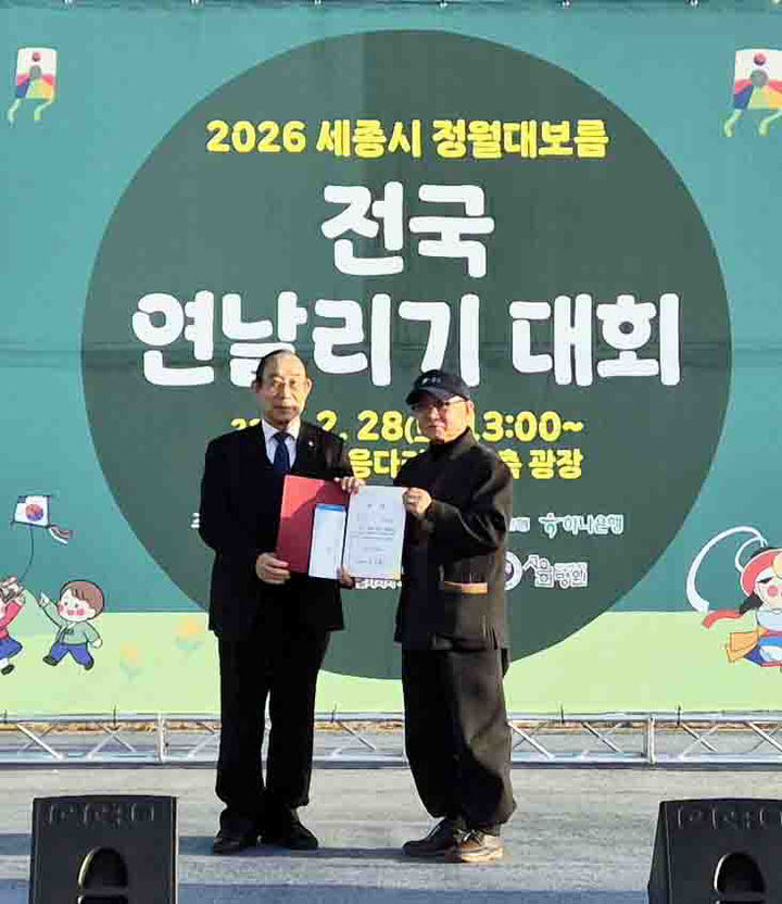 [서울=뉴시스] 세종시(시장 최민호)와 세종문화원(원장 임장철)은 지난 28일 이응다리 일원에서 「2026년 세종시 정월대보름 전국 연날리기 대회」를 개최했다. 올해로 제3회를 맞은 이번 대회에는 높이날리기 40팀과 창작연날리기 26팀이 참가했다. 진행은 이도기획이, 심사는 리기태 방패연 명장(한국연협회·리기태연보존회·NNH 회장)이 담당했다. 심사를 맡은 리기태 명장은 중국 베이징 연 축제 및 연날리기 대회에서 1등 대상 챔피언을 획득한 바 있다. 그의 작품인 황금운용·우롱·돌쪽바지기눈쟁이연 3점은 현재 프랑스 파리 케 브랑리 국립박물관(Mus?e du quai Branly)에 소장·전시 중이다. 그는 조선시대 마지막 남은 유일의 전통연인 방패연 원형기법 보유자이기도 하다. 사진은 임창철 세종문화원장이 세종시 정월대보름 전국 연날리기 대회 창작연날리기 부문에서 은상을 수상한 인천시 남동구에서 참가한 강연중 수상자에게 시상 후 기념촬영을 하고 있다. (사진=리기태연보존회 제공) 2026.03.02. [email protected] *재판매 및 DB 금지