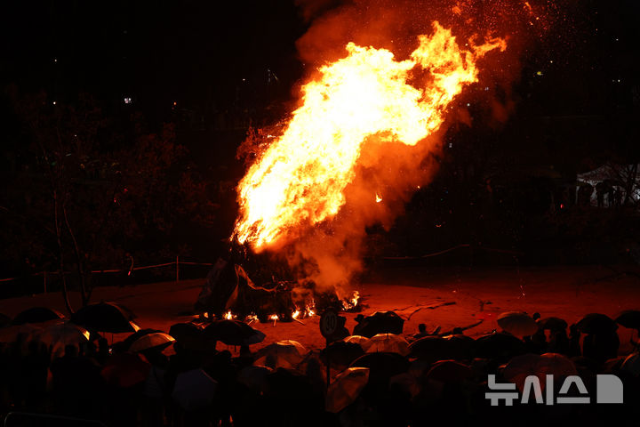 [서울=뉴시스] 이영환 기자 = 정월대보름을 하루 앞둔 2일 오후 서울 서초구 양재천 영동1교 인근에서 열린 제16회 정월대보름 달맞이 대축제에서 달집태우기가 진행되고 있다. 2026.03.02. [email protected]