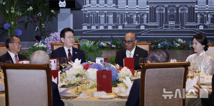 [싱가포르=뉴시스] 최동준 기자 = 싱가포르를 국빈 방문 중인 이재명 대통령과 김혜경 여사가 2일(현지 시간) 한 호텔에서 열린 국빈만찬에서 타르만 샨무가라트남 대통령과 자리하고 있다. 2026.03.02. [email protected]