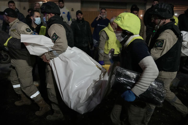 [베이루트=AP/뉴시스] 2일(현지 시간) 레바논 베이루트 남부 즈나(Jnah)에서 구조대가 이스라엘의 공습으로 숨진 희생자 시신을 옮기고 있다. 2026.03.03.