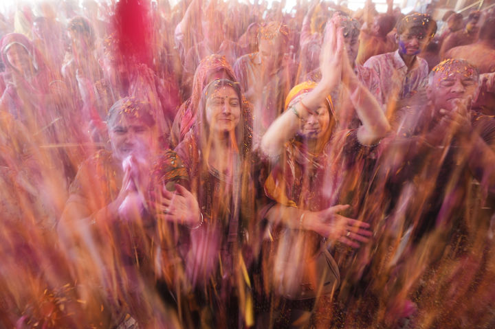 [아마다바드=AP/뉴시스] 3일(현지 시간) 인도 아마다바드 자간나트 사원에서 힌두교 색 축제 '홀리'(Holi)를 맞은 신자들이 꽃잎을 뿌리며 '홀리'를 축하하고 있다. 2026.03.03.