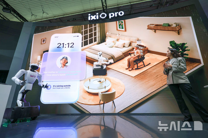 [바르셀로나=뉴시스] 사진공동취재단 = 2일(현지 시간) 스페인 바르셀로나 피라 그란 비아 전시장에서 열린 '모바일 월드 콩그레스(MWC)2026'에서 LG유플러스 부스에서 AI에이전트 '익시오'가 그린 미래를 시연하는 로봇이 등장하고 있다. 2026.03.03. [email protected]