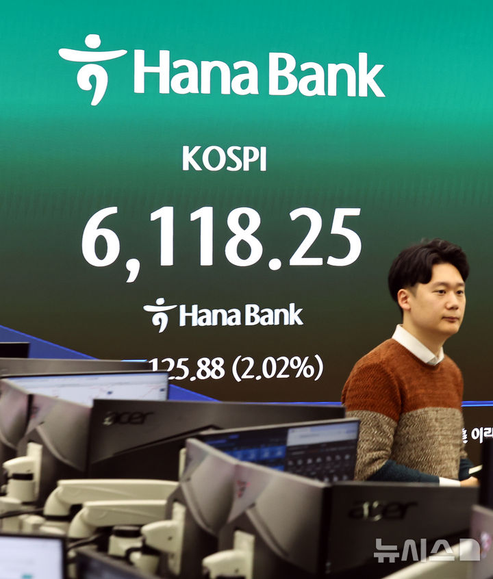 [서울=뉴시스] 최진석 기자 = 코스피가 전 거래일(6244.13)보다 78.98포인트(1.26%) 하락한 6165.15에 개장한 3일 서울 중구 하나은행 딜링룸에 코스피 시세가 보이고 있다.