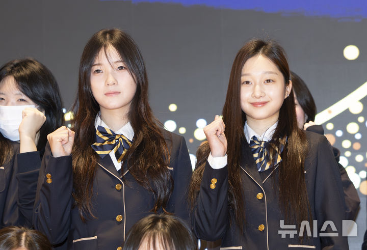 [서울=뉴시스] 김근수 기자 = 2026 밀라노 코르티나 동계올림픽에 출전한 스노보드 최가온(왼쪽)과 피겨스케이팅 신지아가 3일 서울 서초구 세화여자고등학교 강당에서 열린 특별장학금 수여식에서 장학금을 받고 2학년 6반 친구들과 기념촬영을 하고 있다. 2026.03.03. [email protected]