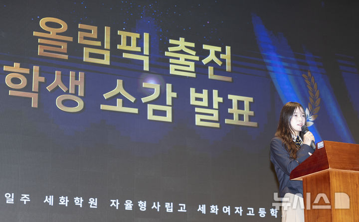 [서울=뉴시스] 김근수 기자 = 2026 밀라노 코르티나 동계올림픽 금메달리스트 스노보드 최가온이 3일 서울 서초구 세화여자고등학교 강당에서 열린 특별장학금 수여식에서 장학금을 받고 소감을 밝히고 있다. 2026.03.03. [email protected]