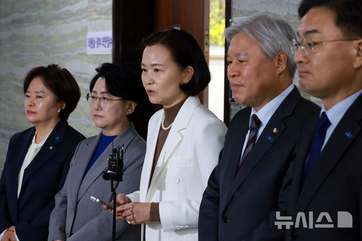 [서울=뉴시스] 고승민 기자 = 조국혁신당 서왕진 원내대표와 이해민 등 의원들이 3일 서울 여의도 국회 의안과에서 '국회 본회의장 동료 의원 폭행 국회의원 서명옥 징계요구안'을 제출한 뒤 입장을 밝히고 있다. 2026.03.03. [email protected]