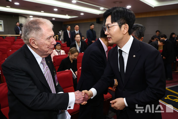 [서울=뉴시스] 김명년 기자 = 마이클 커비 전 유엔 북한인권조사위원장이 3일 오전 서울 여의도 국회 의원회관에서 열린 '북한인권법 제정 10주년 국민보고대회'에서 박충권 국민의힘 의원과 대화하고 있다. 2026.03.03. [email protected]