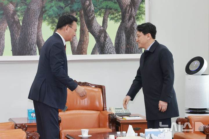 [서울=뉴시스] 김금보 기자 = 천준호 더불어민주당 원내운영수석부대표와 유상범 국민의힘 원내운영수석부대표가 4일 오전 서울 여의도 국회에서 면담에 앞서 인사를 나누고 있다. (공동취재) 2026.03.04. [email protected]