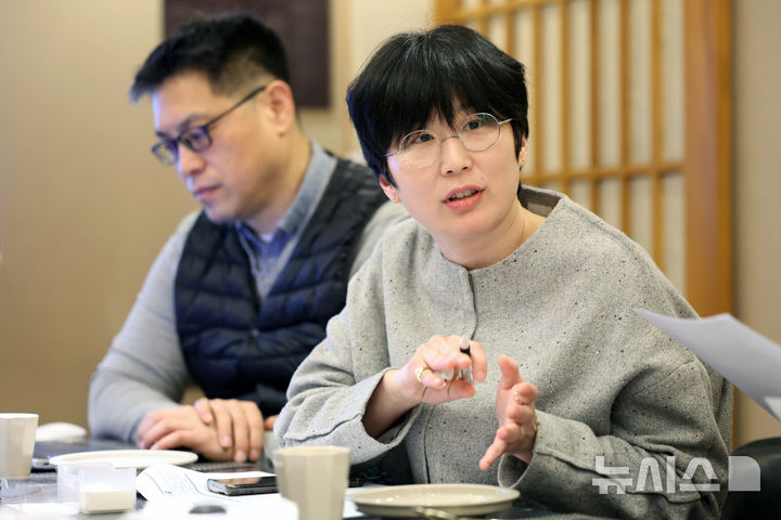 [서울=뉴시스] 박진희 기자 = 아트서울조직위원회 고윤정(오른쪽) 전시실장과 이지헌 이사가 4일 서울 종로구 한 식당에서 '20!2026 ART SEOUL' 기자간담회를 하고 있다. 디지털 플랫폼 기반 온라인 전시 '아트서울'은 디지털 온라인 유통 시스템의 새로운 상생 모델을 제시하는 전시다. 2026.03.04. [email protected]