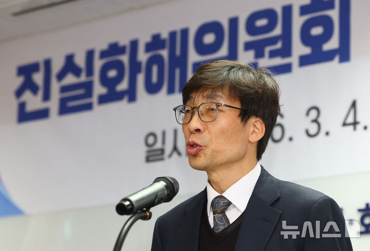 [서울=뉴시스] 황준선 기자 = 송상교 신임 진실·화해를위한과거사정리위원회 위원장이 4일 오후 서울 중구 진실화해위에서 열린 취임식에서 취임사 하고 있다. 2026.03.04. [email protected]