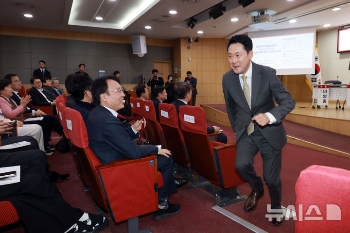 [서울=뉴시스] 고승민 기자 = 장동혁 국민의힘 대표가 4일 서울 여의도 국회 의원회관에서 '글로벌 대전환 시대, 이재명 정부 정책 : 평가와 전망'을 주제로 열린 여의도연구원 창립 31주년 연속 토론회에서 축사 후 다음 일정인 대구경북 통합법 처리촉구 규탄대회 참석을 위해 뛰어가고 있다. 2026.03.04. [email protected]