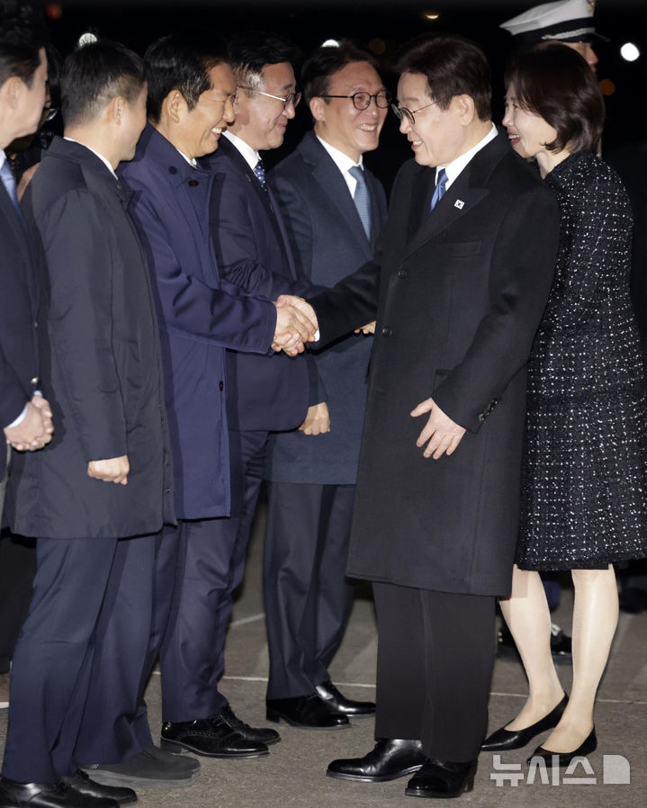 [성남=뉴시스] 최동준 기자 = 싱가포르-필리핀 국빈 방문 일정을 마친 이재명 대통령이 4일 경기 성남 서울공항에 도착해 정청래 더불어민주당 대표와 인사하고 있다. 2026.03.04. [email protected]