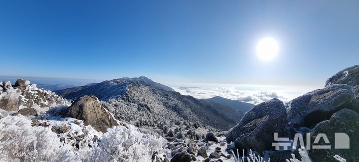 [산청=뉴시스] 5일 지리산 촛대봉에서 바라본 천왕봉과 세석평전이 최근 내린 눈(7cm가량)과 운해로 아름다움을 뽐내고 있다. (사진=산청군 제공) 2026. 03. 05. [email protected]