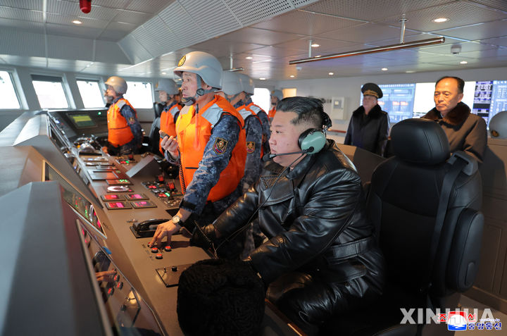 [평양=신화/뉴시스] 북한 조선중앙통신(KCNA)이 5일 배포한 사진에 김정은 북한 총비서가 남포 조선소에 있는 '최현' 구축함에 승선해 장병들의 함정 운용 상황과 각종 무기체계의 작전 준비 태세를 점검하고 있다. 통신은 김 총비서가 지난 3~4일 이틀간 최현호에 올라 "해상 핵 무장화가 만족스럽게 수행되고 있다"라고 말했다고 보도했다. 2026.03.05.