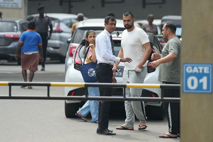 [갈레=AP/뉴시스] 스리랑카 남쪽 해역에서 침몰된 이란 해군 호위함 '아이리스 데나'에서 구조된 승조원 2명이 5일(현지 시간) 갈레에 있는 국립병원 입구에서 보안 요원과 얘기를 나누고 있다. 미국은 "'아이리스 데나'호는 미군 잠수함의 어뢰 공격으로 침몰한 것"이라고 밝혔다. 침몰 당시 이 호위함에는 승조원 180명이 타고 있었으며 32명이 구조되고 시신 87구가 수습돼 사망자 숫자는 더 늘어날 것으로 보인다. 2026.03.05.