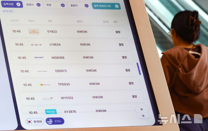 [인천공항=뉴시스] 황준선 기자 = 미국·이스라엘과 이란의 군사 충돌 여파로 중동 지역 항공편 차질이 이어지고 있는 5일 인천국제공항 1터미널 도착층 전광판에 아부 다비 발 항공편의 결항이 안내되고 있다. 2026.03.05. [email protected]