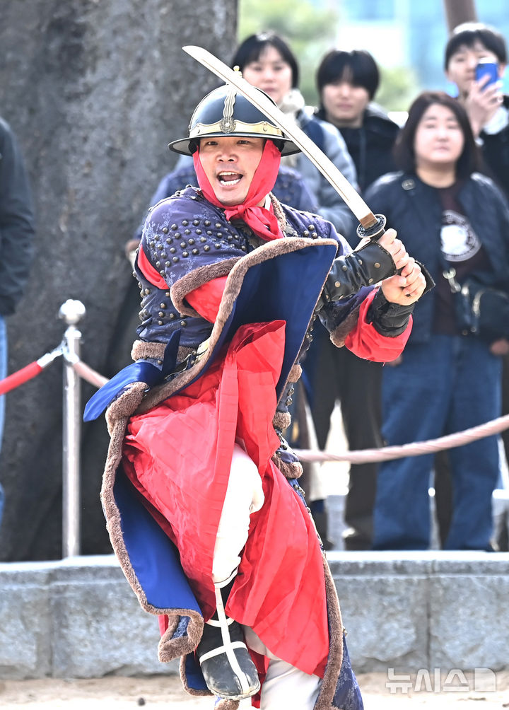 [수원=뉴시스] 김종택 기자 = 절기상 경칩인 5일 경기 수원시 팔달구 화성행궁에서 혹한기 정기휴연을 마친 수원시립공연단원들이 무예24기 공연을 펼치고 있다. 2026.03.05. [email protected]