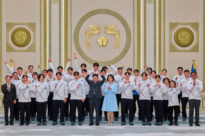 [서울=뉴시스] 고범준 기자 = 이재명 대통령과 김혜경 여사가 5일 청와대 영빈관에서 열린 2026 밀라노·코르티나담페초 동계올림픽 선수단 격려 오찬에서 선수단 등 참석자들과 기념촬영을 하고 있다. (사진=청와대 제공) 2026.03.05. [email protected] *재판매 및 DB 금지