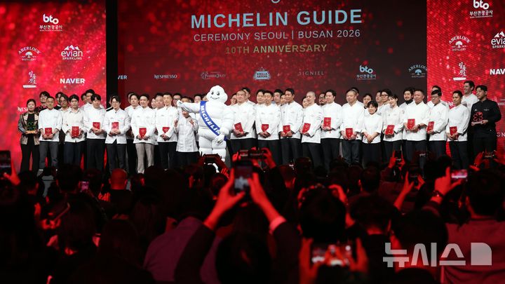 [부산=뉴시스] 하경민 기자 = '미쉐린 가이드 세리머니 서울&부산 2026' 행사가 열린 5일 부산 해운대구 시그니엘 부산에서 3스타 등을 수상한 쉐프들이 기념촬영을 하고 있다. 2026.03.05. [email protected]
