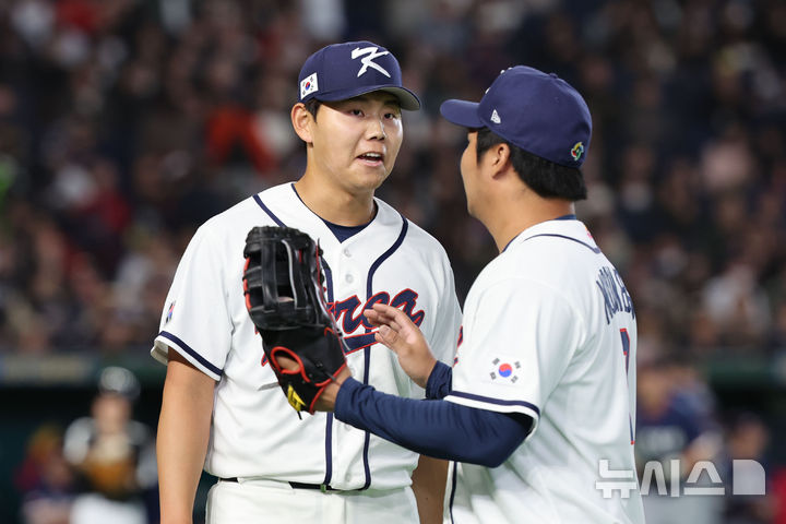 [도쿄=뉴시스] 권창회 기자 = 5일 일본 도쿄돔에서 열린 2026 WBC 조별리그 C조 1차전 한국과 체코와의 경기, 2회초 2사 만루위기를 무실점으로 넘긴 소형준이 동료들을 맞이하고 있다. 2026.03.05. [email protected]