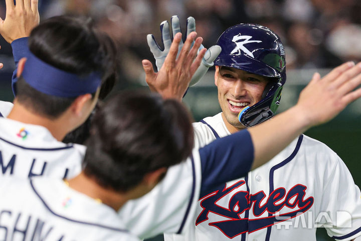 [도쿄=뉴시스] 권창회 기자 = 5일 일본 도쿄돔에서 열린 2026 WBC 조별리그 C조 1차전 한국과 체코와의 경기, 5회말 1사1루 한국 셰이 위트컴이 투런 홈런을 친 뒤 동료들의 축하를 받고 있다. 2026.03.05. [email protected]