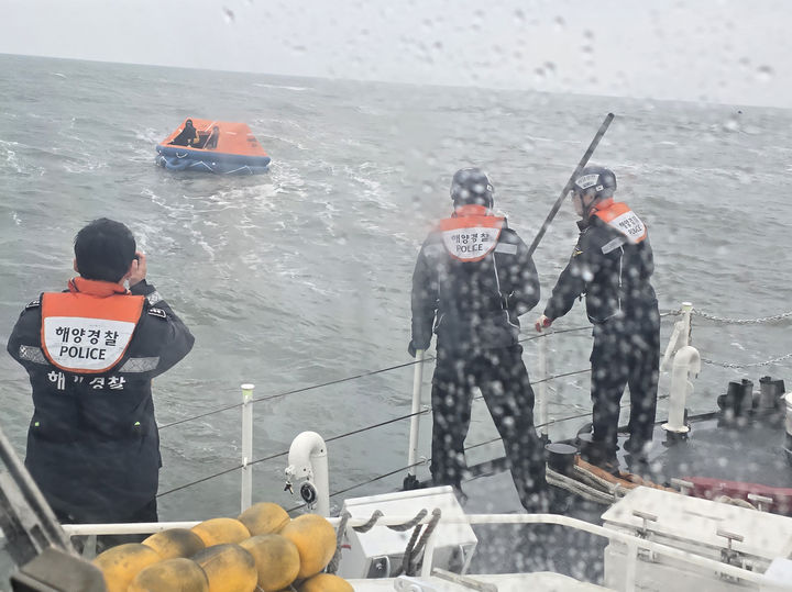 [홍성=뉴시스] 유효상 기자 = 보령해양경찰서 구조대가 6일 오후 3시 55분경 충남 보령시 오천면 소화사도 인근 해상에서 발생한 어선A호(69t, 근해안강망) 침몰 현장에서 승선원들을 구조하고 있다. (사진=보령해경 제공) 2026.03.06 [email protected]