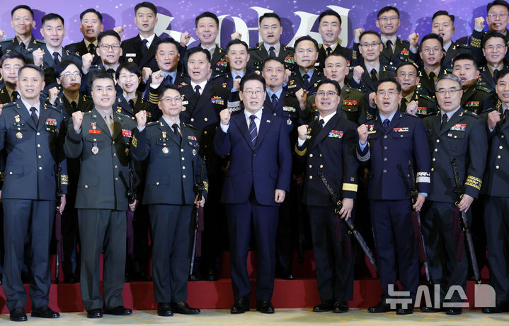 [서울=뉴시스] 최동준 기자 = 이재명 대통령이 6일 청와대 영빈관에서 열린 2026년 준장 진급 장성 삼정검 수여식에서 진급 장성과 기념촬영을 하고 있다. 2026.03.06. [email protected]