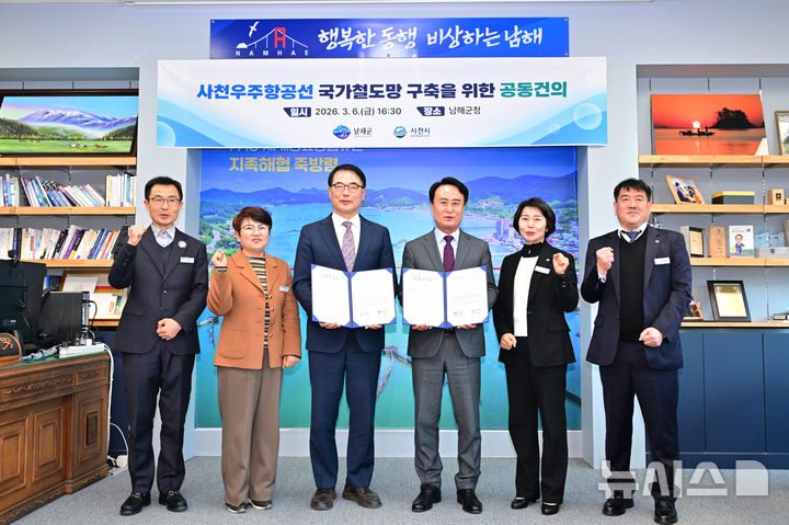 [남해=뉴시스] 차용현 기자 = 장충남 남해군수와 박동식 사천시장을 비롯한 참석자들이 6일 오후 경남 남해군청 군수실에서 국토교통부의 ‘제5차 국가철도망 구축계획’에 ‘사천우주항공선’ 반영을 요청하는 건의문을 채택하고 기념촬영을 하고 있다. 2026.03.06. [email protected]
