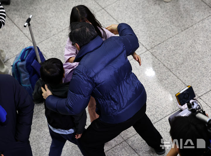 [인천공항=뉴시스] 최진석 기자 = 이란 사태 여파로 중단됐던 아랍에미리트(UAE) 두바이공항에서 인천국제공항으로 오는 직항편 운항이 재개된 6일 인천국제공항 제1여객터미널을 통해 귀국한 두바이 출발 EK322편 탑승객들이 마중나온 가족과 포옹하고 있다. 2026.03.06. [email protected]